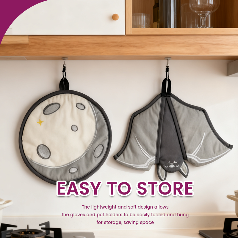 The lightweight and soft design allows gloves and pot holders to be easily folded and hung for storage, taking up minimal space.